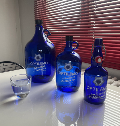The blue glass bottle protects the OptiLeMo water from UV light.