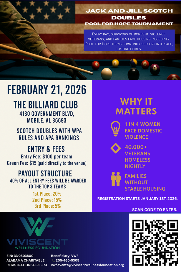 Our national pool tournament funds housing, education, and recovery for veterans, survivors of domestic violence, and underserved families. It creates sustainable support while rebuilding connection, dignity, and purpose.