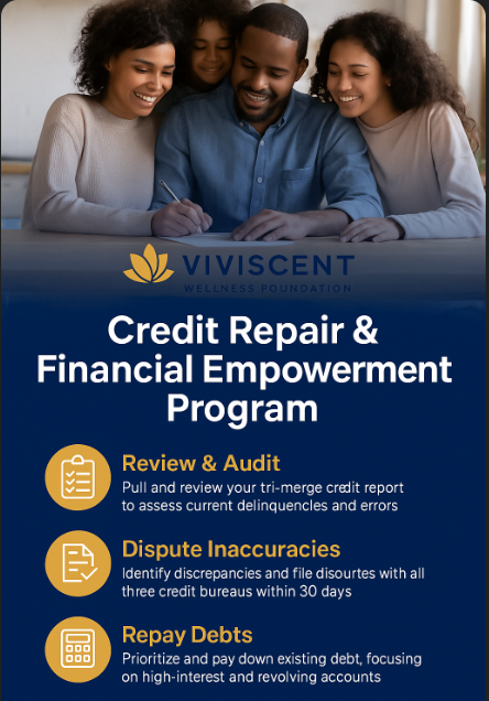 The Viviscent Wellness Foundation’s Credit Repair & Financial Empowerment Program offers step-by-step coaching, education, and accountability to help you reach your financial goals. We work with veterans, families, and individuals ready to take control of their credit and build a foundation for lasting success.