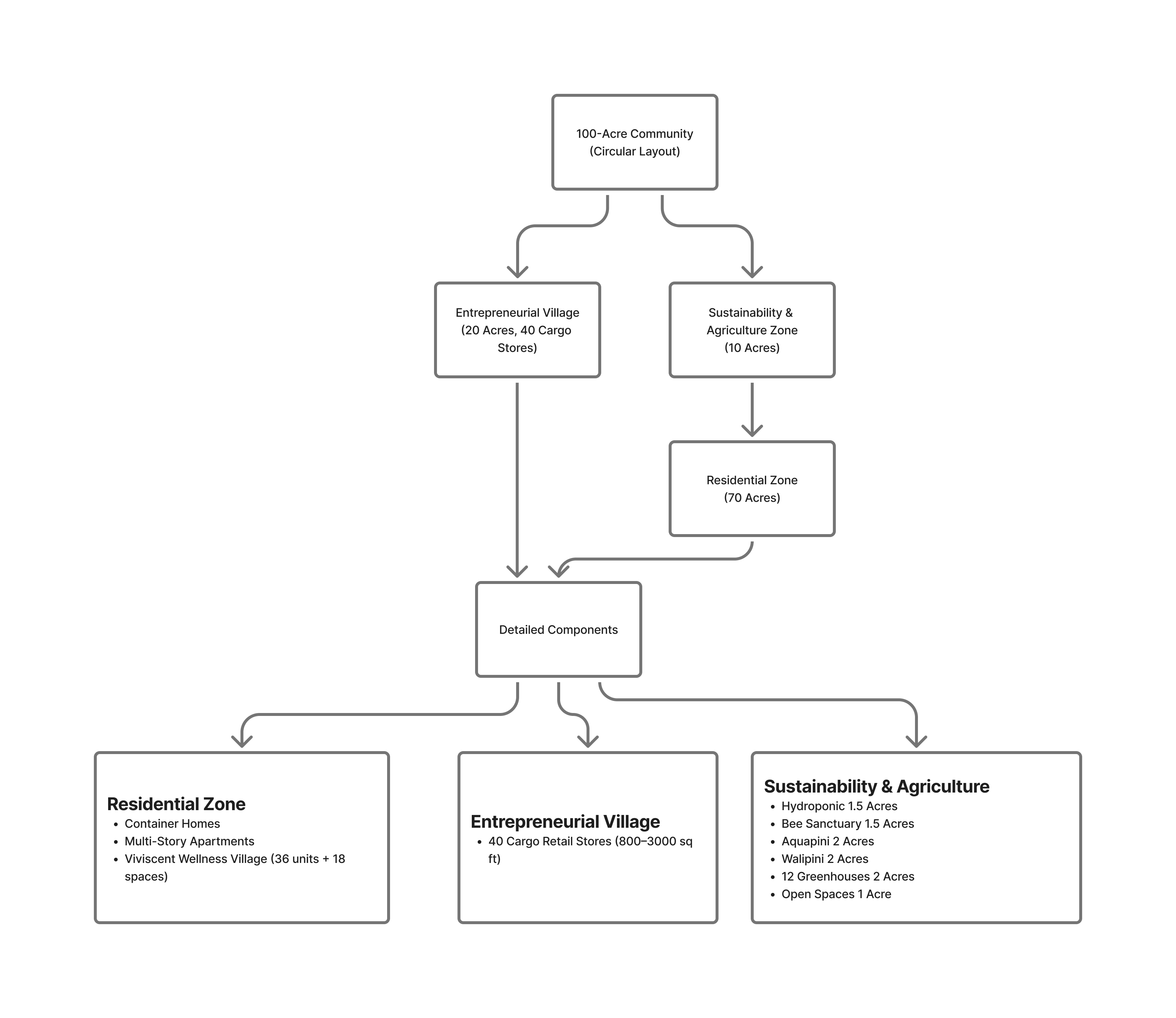 A 100-acre mixed-use development integrating modern residential solutions, an entrepreneurial retail village, and sustainability initiatives in a cohesive circular layout.- Innovative Eco-Building: